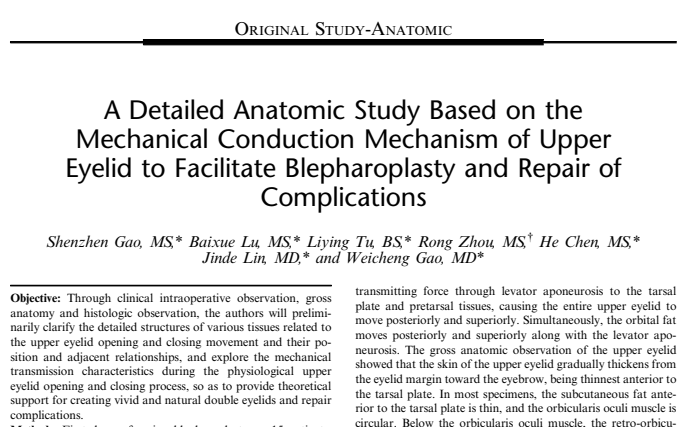 高伟成教授为通信作者,高深圳、卢白雪等医师为作者的论文《A Detailed Anatomical Study Based on the Mechanical Conduction Mechanism of Upper Eyelid to Facilitate Blepharoplasty and Repair of Complications》在《Journal of Craniofacial Surgery》2025年12月发表。该研究通过临床手术观察、大体解剖与组织染色,明确了上睑各层结构的位置关系,以及睁眼闭眼时的 “力学传导规律”。这一发现为自然双眼皮成形术、上睑下垂修复等手术提供 “精准解剖地图”,避免因结构认知不足导致的术后双眼皮过宽、不对称、睁眼费力等并发症,帮助医生打造更贴合生理功能的自然眼型。