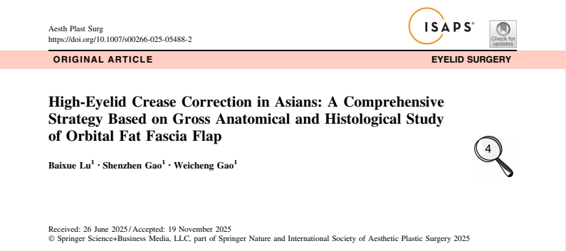 高伟成教授为通信作者,高深圳、卢白雪等医师为作者的论文《High Eyelid Crease Correction in Asians: A Comprehensive Strategy Based on Gross Anatomical and Histological Study of Orbital Fat Fascia Flap》在《Aesthetic Plastic Surgery》2025年11月线上发表。该研究聚焦中国人眼型特点,深入研究眶隔脂肪筋膜瓣的解剖结构与血供规律,创新研发 “保留血管蒂的眶隔脂肪筋膜瓣滑动区重建技术”,解决国人眼整形术后修复双眼皮过宽的核心难题。