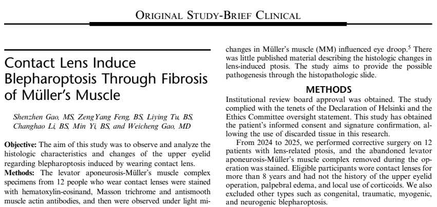 高伟成教授为通信作者,高深圳、冯锃扬等医师为作者的论文《Contact Lens Induce Blepharoptosis Through Fibrosis of Müller’s Muscle》在《Journal of Craniofacial Surgery》2025年第36期发表。该研究针对全球数亿隐形眼镜使用者常见的 “眼皮耷拉”(后天性上睑下垂)问题,通过组织学分析发现:长期佩戴隐形眼镜导致上睑下垂的核心原因是上睑内 Müller 肌的纤维化病变,这一发现为这类后天性上睑下垂的精准治疗提供新理论基础,帮助更多求美者摆脱 “睁眼费力、影响视力与美观” 的困扰。