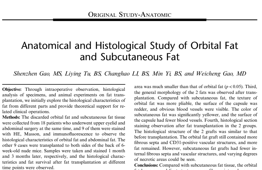高伟成教授为通信作者,高深圳、涂立颖等医师为作者的论文《Anatomical and Histological Study of Orbital Fat and Subcutaneous Fat》在《Journal of Craniofacial Surgery》2025年8月发表。该研究通过动物实验与临床观察对比了眼睑眶隔脂肪与腹部皮下脂肪的组织学差异,证实了眶隔脂肪质地更细腻、纤维间隔更丰富、血管密度更高,移植后存活率显著优于皮下脂肪。这一成果为上睑凹陷填充等项目提供 “优选脂肪来源”,让填充效果更自然持久,有效改善 “眼窝凹陷显老” 等问题。