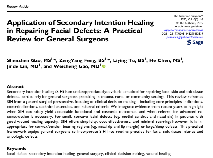 高伟成教授为通信作者,高深圳、冯锃扬等医师为作者的论文《Application of Secondary Intention Healing in Repairing Facial Defects: A Practical Review for General Surgeon》在《The American Surgeon》2025年12月发表。针对面部外伤、肿物切除后的皮肤缺损,我院为临床医生提供 “再生愈合”应用指南,该方案安全经济,尤其适用于美容医疗场景,兼顾面部功能与美观,取得了较好的临床效果。